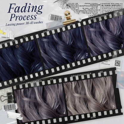 Bruise is a dark greyish shade with a dusty blueish tint. It is ultra-wearable, perfect for those who want an understated hair colour. After some washes, the blue tint will fade off, leaving a matte grey look that fades to silver over time. Bruise It only works on pre-lightened level 7 hair or lighter (refer to listing images). The colour turns out the best when it's applied to non-brassy hair. If you are starting off with a yellowish blonde base, try toning it with diluted Iris or Smoke to remove the yellow hues before going in with Bruise. Bruise will look like a muted blueish purple on level 9 and 10 hair.